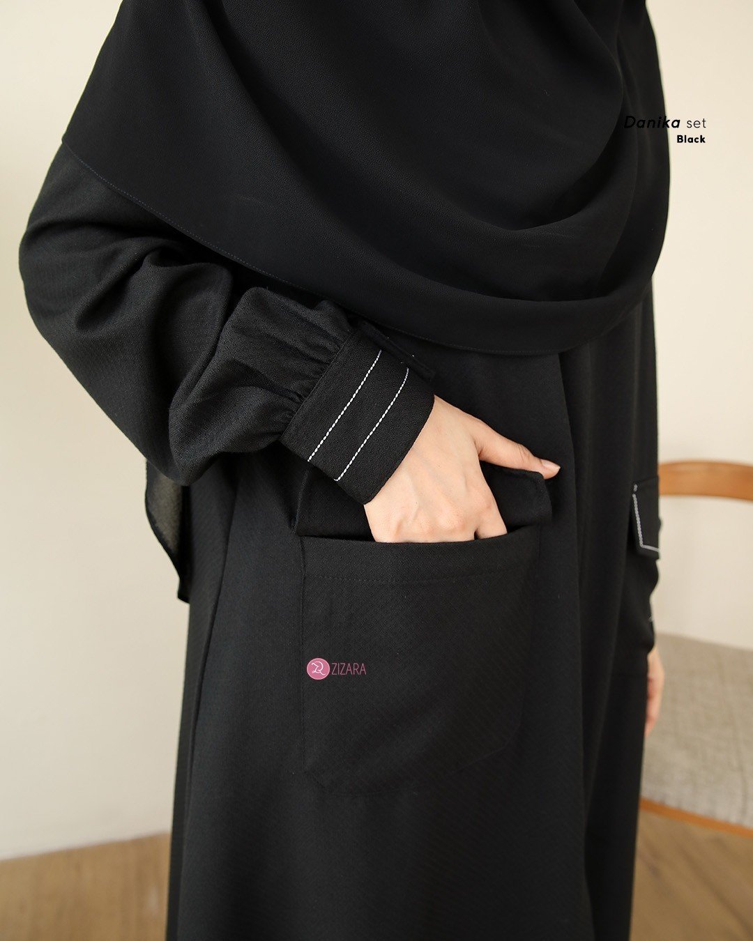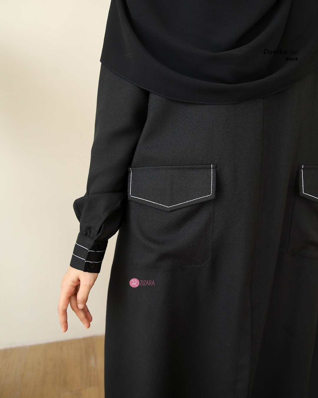 3. Lengan maset berkancing dengan aksen benang putih, dilengkapi juga plat signature zizara